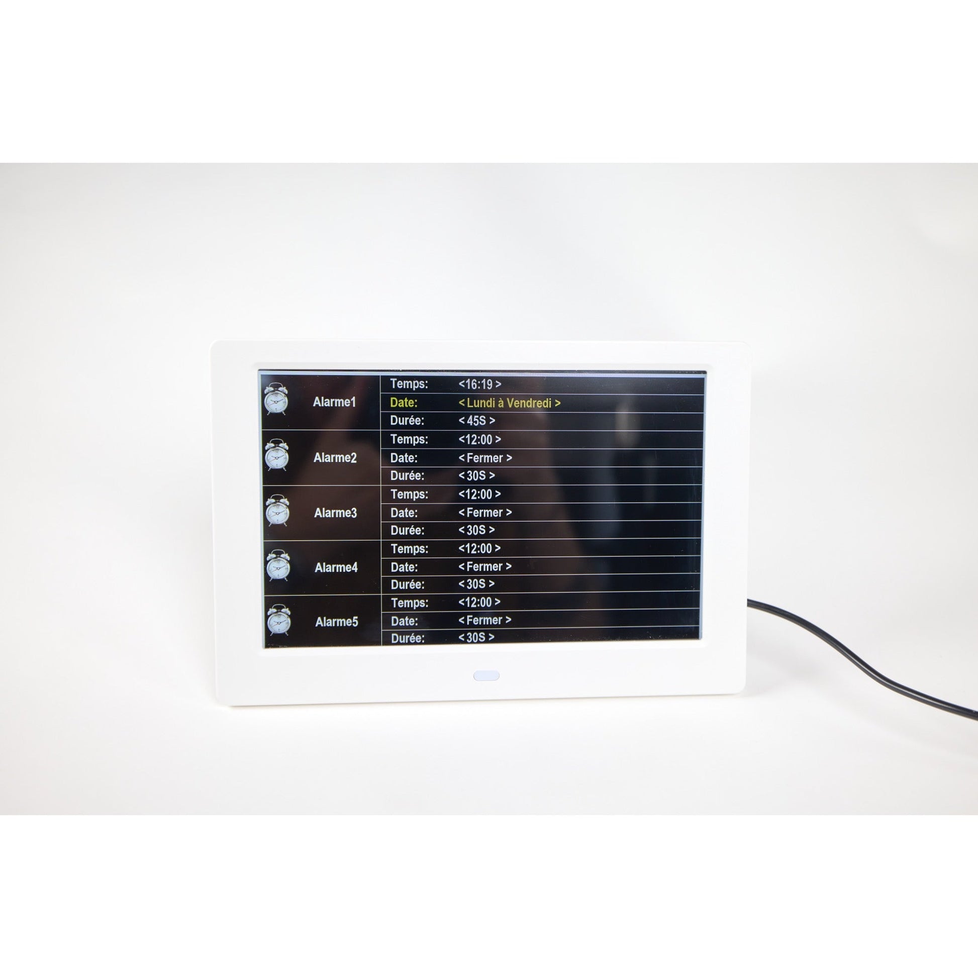Vous avez aussi la possibilité de configurer une alarme pour quelconque nécessité. Il y a 10 alarmes qui peuvent activées. Vous n'aurez dès lors plus qu'à insérer l'heure et les jours auxquels l'alarme s'appliquera, par exemple tous les jours de la semaine, le week-end ou même un jour spécifique de la semaine (par exemple pour un rendez-vous hebdomadaire).