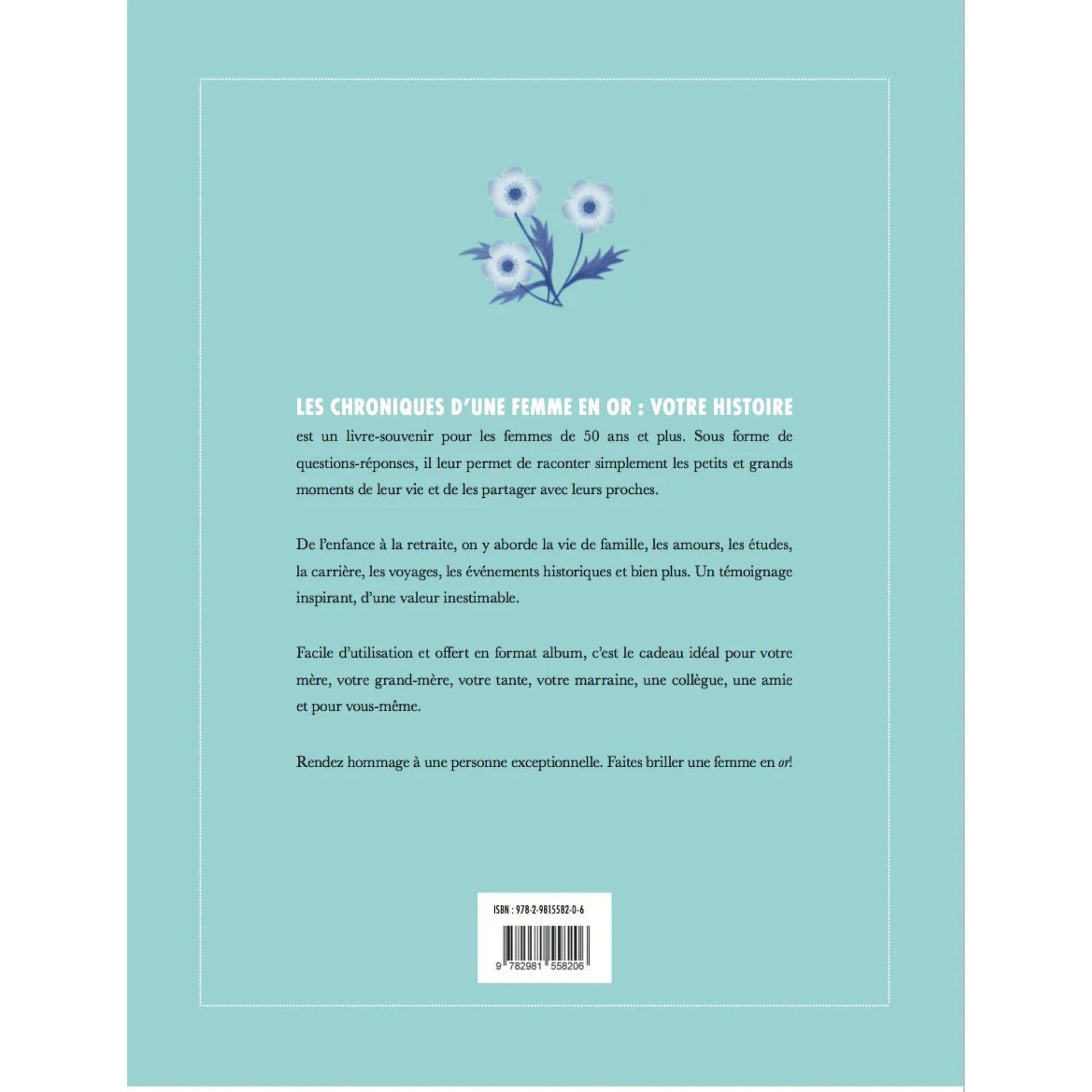 "Chroniques d'une femme en or : votre histoire" est un livre-souvenir pour les femmes de 50 ans et plus. De l'enfance à la retraite, on y aborde la vie de famille, les amours, les études, la carrière, les voyages, les événements historiques et bien plus. Ce livre est en format question-réponse et guidera l'utilisateur dans des souvenirs : un témoignage inspirant, d'une valeur inestimable. Rendez hommage à une personne exceptionnelle. Faites briller une femme en or!