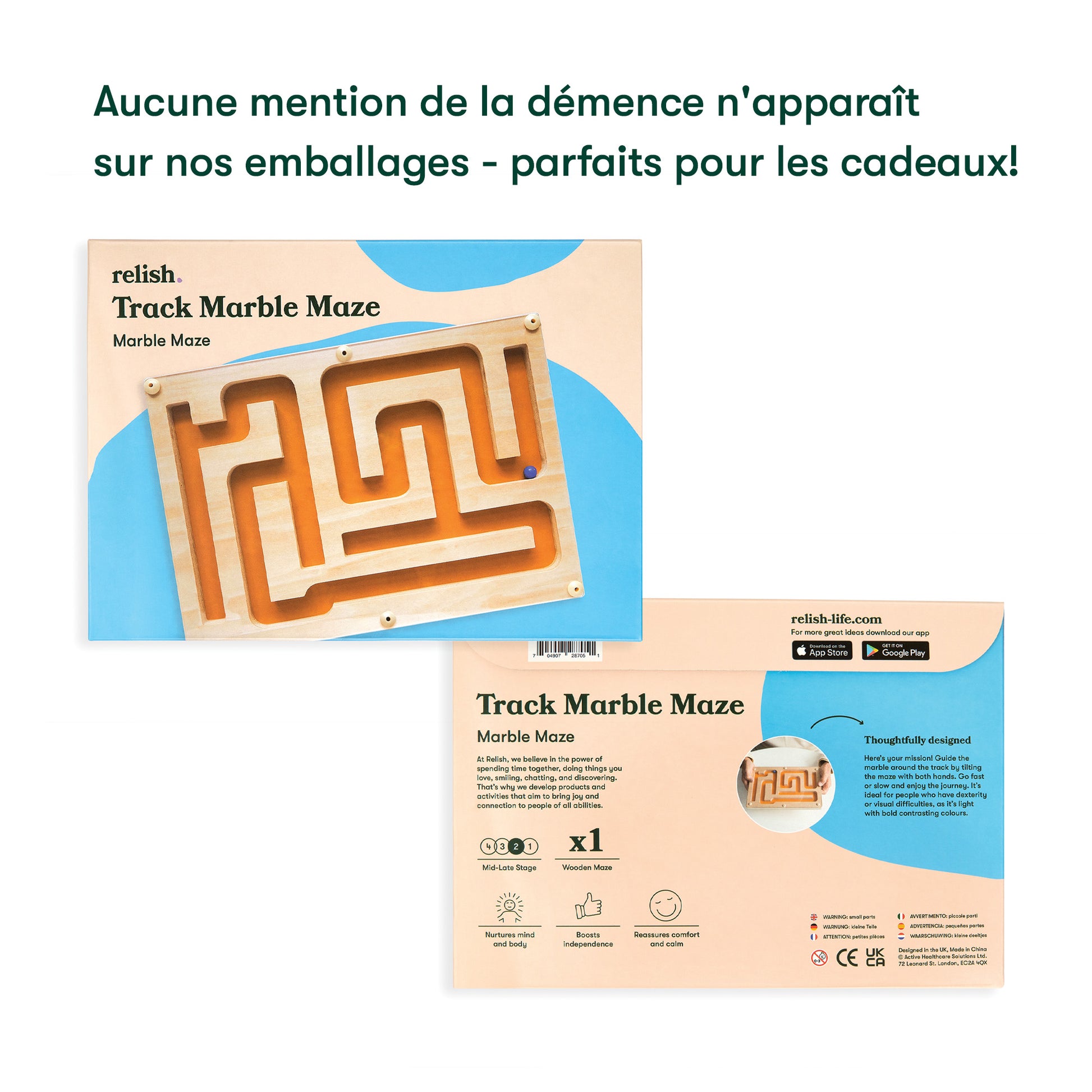 À la fois apaisant et divertissant, le Track Marble Maze est un jeu adapté aux personnes atteintes de démence qui met au défi la dextérité et la coordination. La mission ? Guider la bille autour de la piste en inclinant le labyrinthe avec les deux mains. Tourner. Tournez, reculez. Répétez ! Les joueurs éprouvent forcément un sentiment de satisfaction lorsqu'ils arrivent au bout du parcours. Allez aussi lentement ou aussi rapidement que vous le souhaitez. Souvenez-vous que parfois, l'important n'est pas la destination, mais le voyage.
