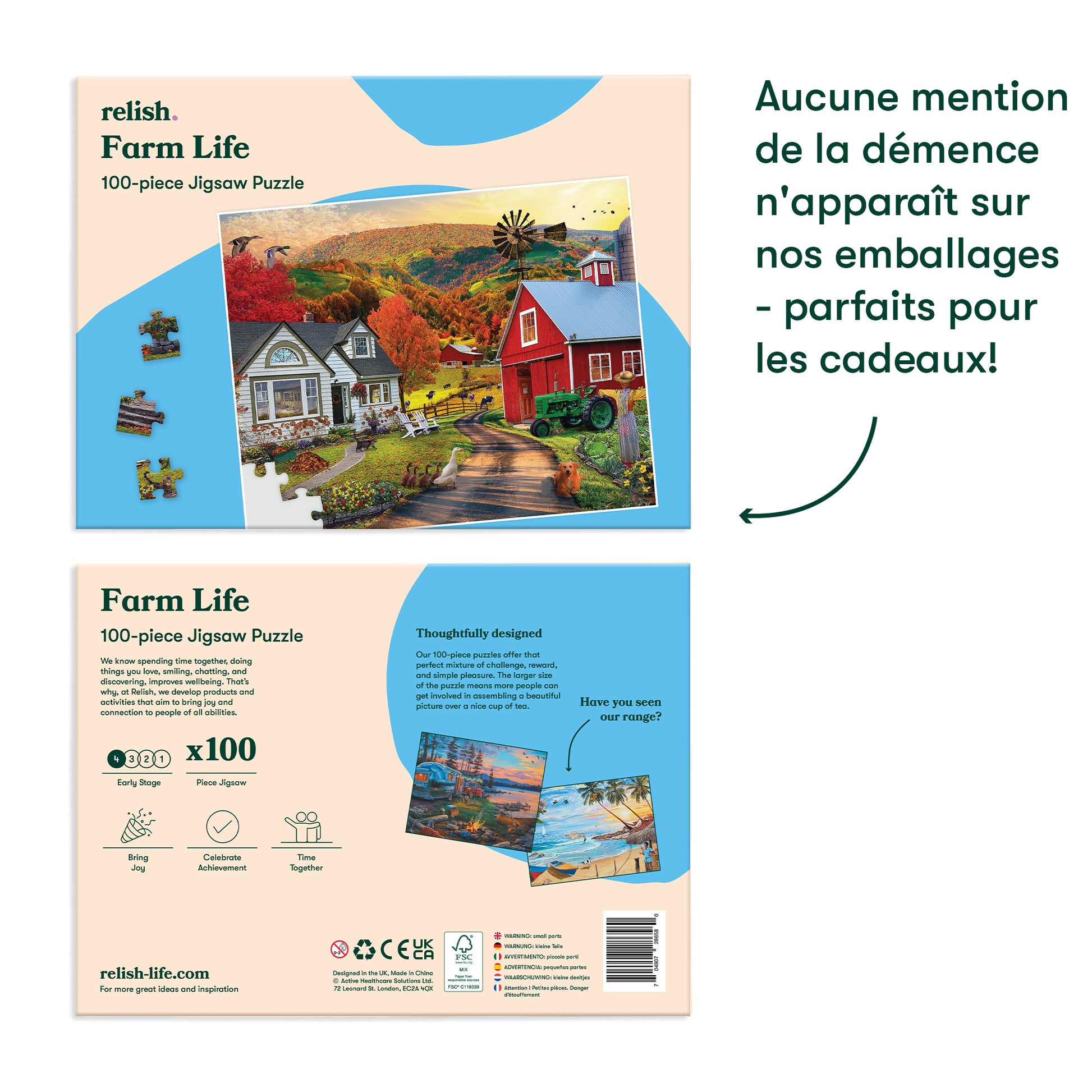 Un puzzle de 100 pièces parfait pour les personnes âgées, les personnes atteintes de démence précoce ou d'Alzheimer, ou tout simplement les personnes qui recherchent un défi plus facile à relever.