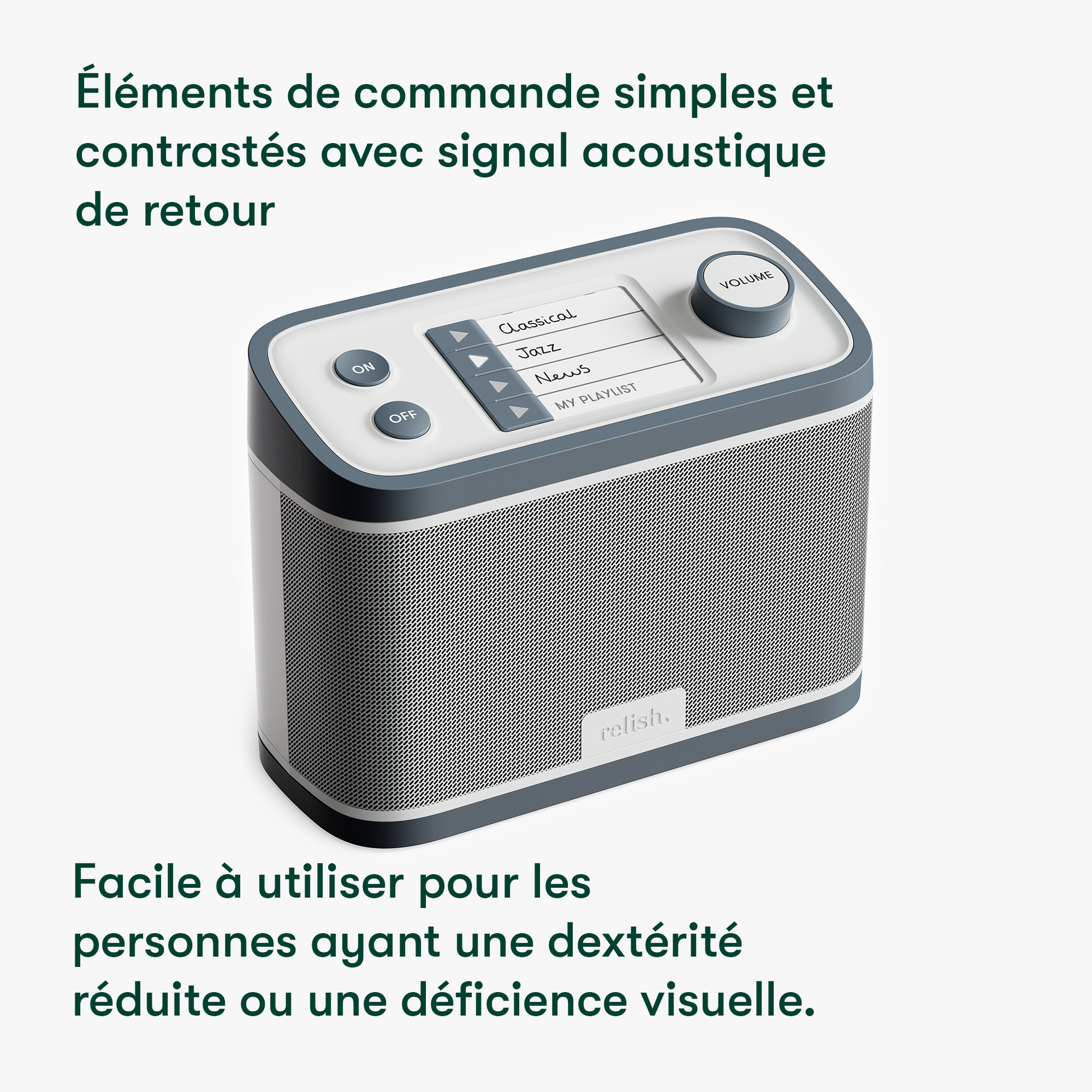 Alliant une esthétique rétro-nostalgique à une finition moderne et contemporaine, cette radio est la préférée des familles. Chaque détail représente la recherche et le raffinement. Qu'il s'agisse du contraste des couleurs, qui offre une plus grande visibilité et une plus grande facilité d'utilisation pour les malvoyants, ou de la tonalité unique des boutons, qui aide les gens à identifier les fonctions en fonction du son, Relish Radio minimise la confusion et maximise l'indépendance.